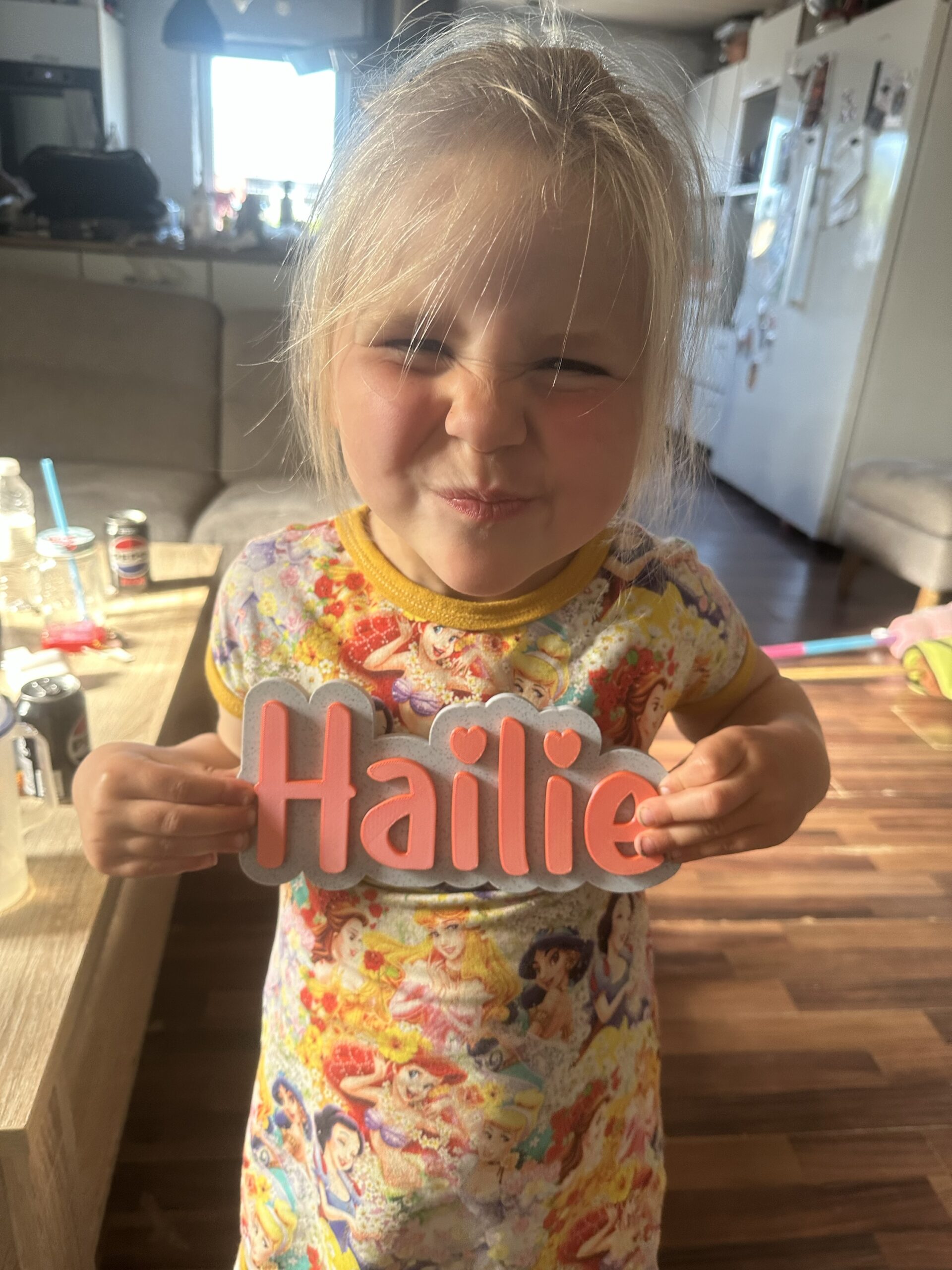 3D printede navneskilte til fx døren til børneværelset. Længde ca 24 cm og højden justere sig efter hvor langt navnet er dvs kort navn højere bogstaver langt navn lavere mere kompakt skilt.