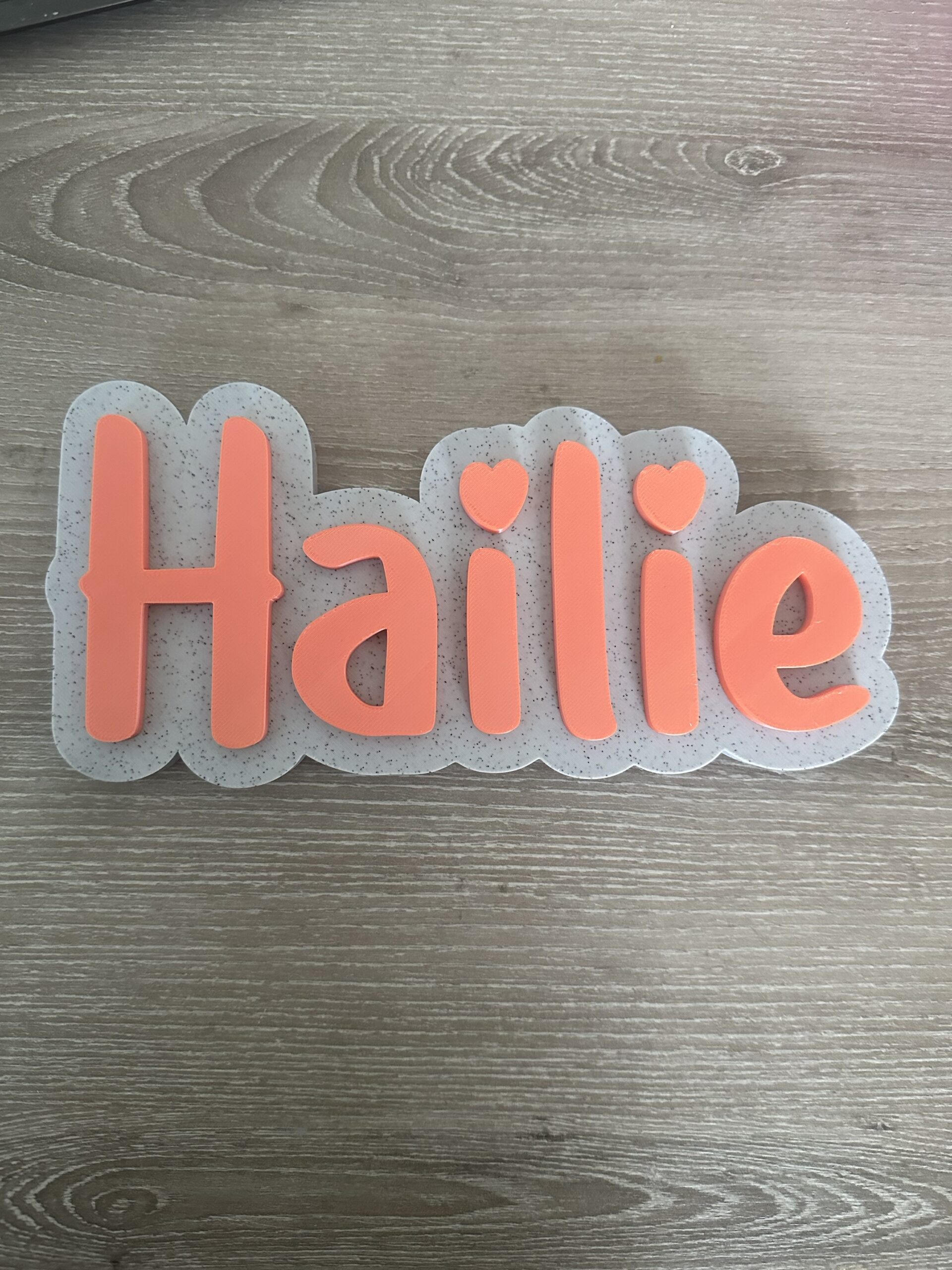 3D printede navneskilte til fx døren til børneværelset. Længde ca 24 cm og højden justere sig efter hvor langt navnet er dvs kort navn højere bogstaver langt navn lavere mere kompakt skilt.